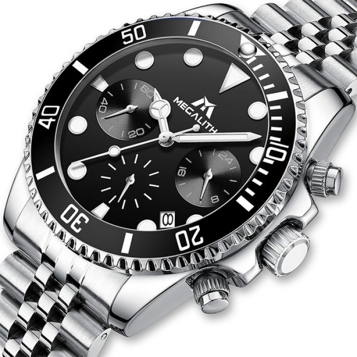 Часы мужские MegaLith Pegas с металлическим браслетом + секундомер и отображение даты Черный/Серебристый