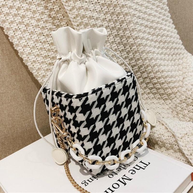 Fashion Houndstooth WOOL Chain Shoulder Bag Bucket Bag Luxury Handbags Women Bags Designer SAC a Main Crossbody Bags for Women, Black