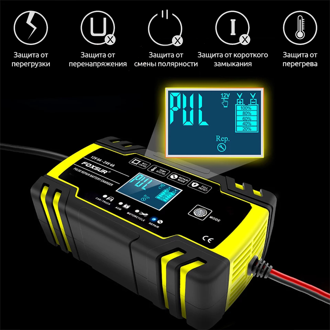 Автоматическое зарядное устройство для аккумулятора авто Foxsur 12/24-8а, 8А 12В/24В 4А, умная зарядка