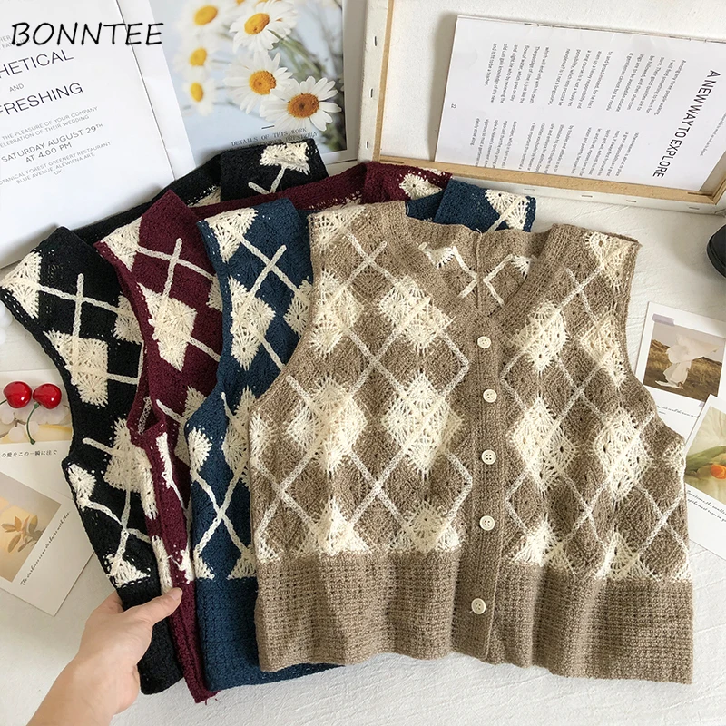 Женский укороченный свитер, винтажный трикотажный джемпер в стиле ретро с узором ромбиками, на пуговицах, для студентов, для повседневного ...