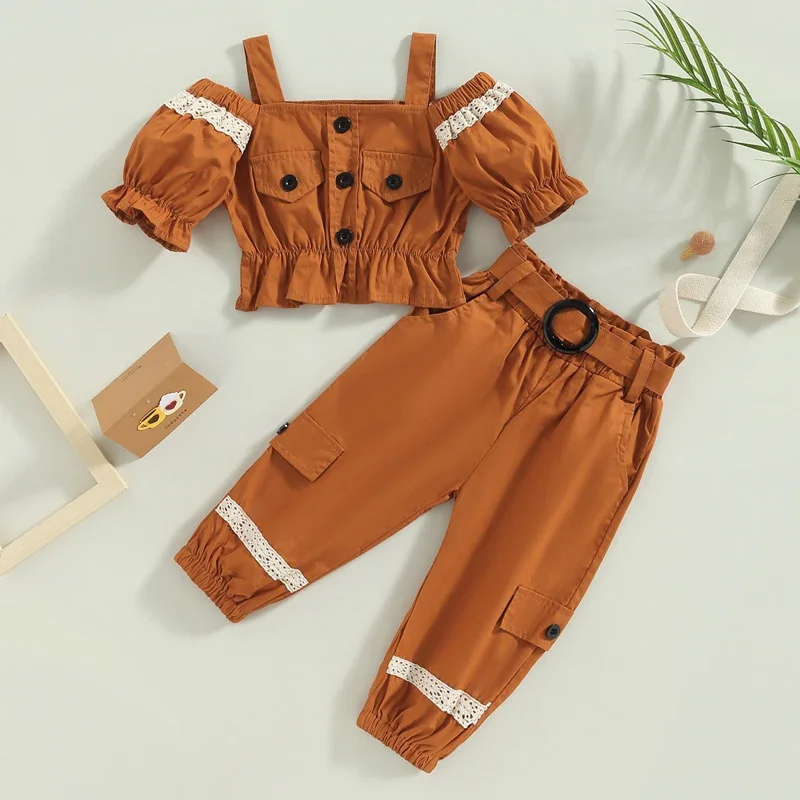 Детские летние наряды из 2 предметов для девочек, топы с открытыми плечами и короткими рукавами, комплект брюк-карго