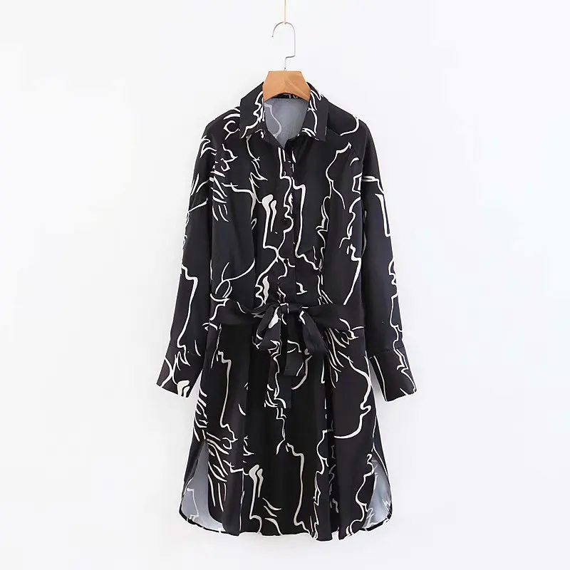 Western Style 2018 Autumn New Style Bow Lace-up Printed Long Version Slim Fit Shirt Dress WOMEN'S Dress