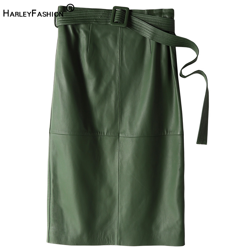 HarleyFashion Winter Women Luxury PU Leather Skirt High Street Green & Khaki & Black Sheap Genuine Leather Touch Straight Skirt LJ201103, Army green