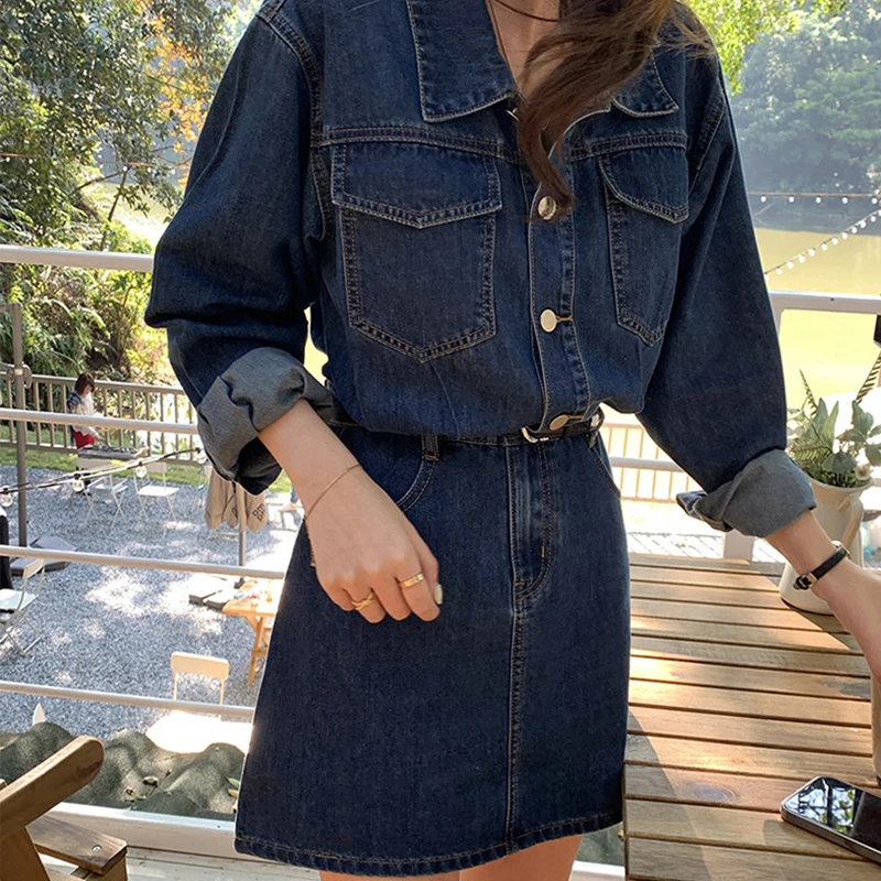 2022 Spring Women's Dress Mini Short Lapel Denim Sweet Cool High Waist Elegant Fashion Long Sleeves Without Belt Female Clothing