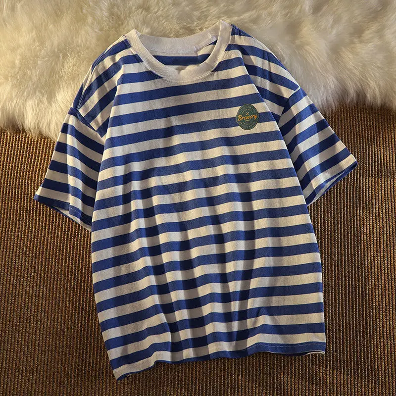 2021NEW Cotton Fashion Women Ladies Casual O Neck Short Sleeve Loose Summer Navy Blue Striped T-shirt Tops Women Clothing
