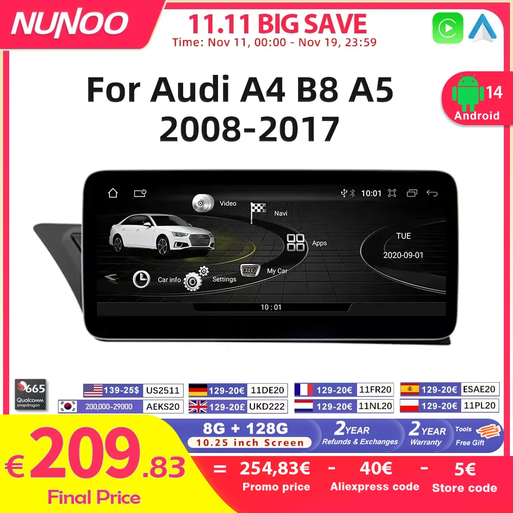 Автомобильный мультимедийный плеер Android 14 для Audi A4 B8 A5 2008-2017, беспроводной автомобильный Интеллектуальный автомобильный навигатор, автомобильное радио