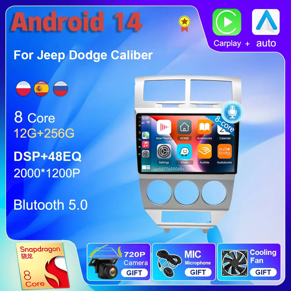 Автомобильный радиоприемник для Dodge Caliber I 2007-2010, Android 14, Wi-Fi + 4G, навигация GPS, видеоплеер, стерео, мультимедиа, DVD, DSP, авто