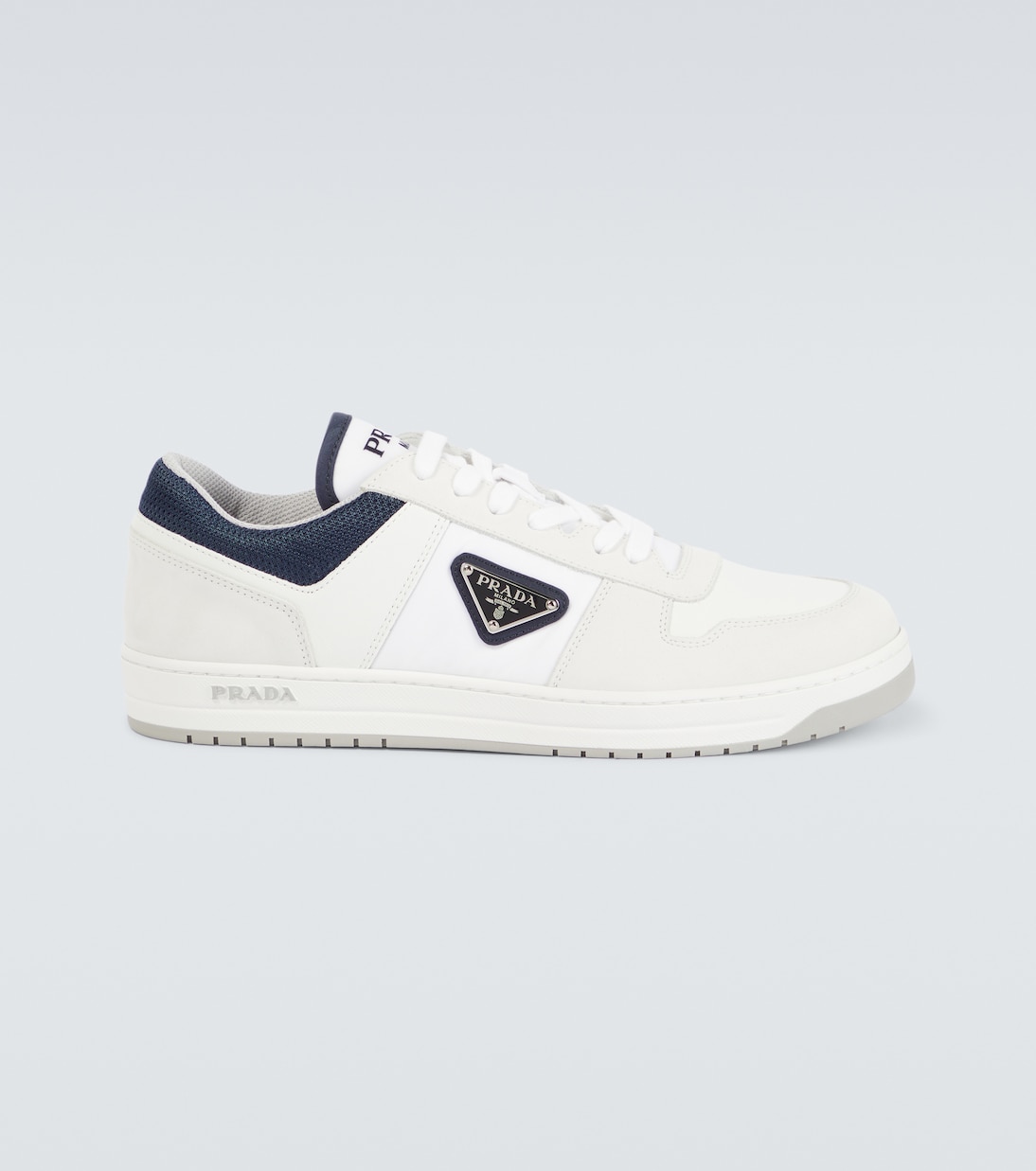 Кроссовки из переработанного нейлона Downtown Re-Nylon с кожаными деталями Prada, Bianco+Oltremare