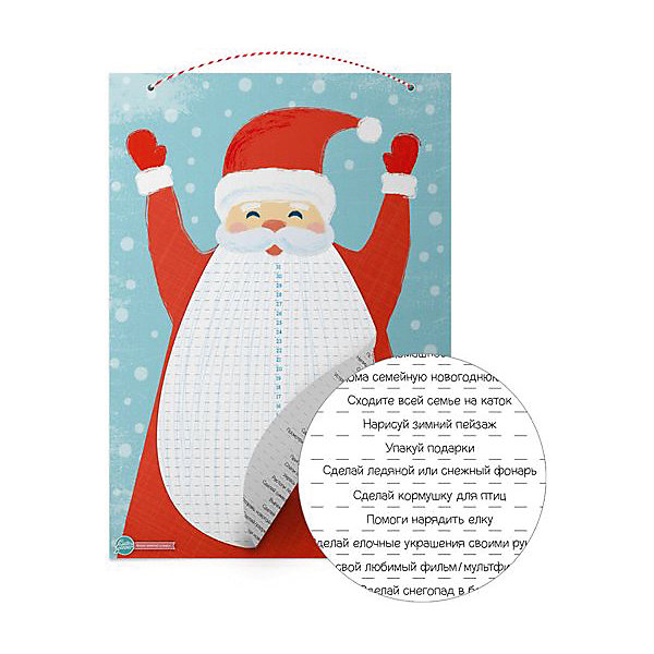 Адвент-календарь «Дед Мороз» (с отрывной бородой) – это плакат на твердой основе с веревочкой для подвешивания на стене, размер плаката: 420 х 297 мм. Рекомендуется детям старше 3 лет. У Дедушки Мороза волшебная борода, на которой приготовлено 31 задание для детей на каждый день Декабря. Ежедневно ребенок отрывает кусочек бороды, получает задание для выполнения. Например, написать письмо Дедушке Морозу, украсить дом к празднику или приготовить горячий шоколад и еще много чего интересного ждет ребят в Декабре.