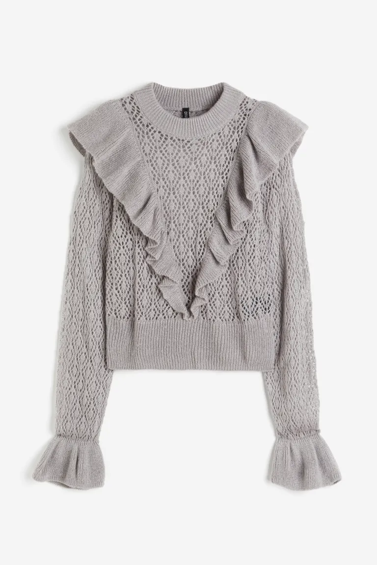 Свитер из мягкой пряжи с ажуром. Имеет круглый вырез горловины, эластичный низ и длинные рукава с рюшами на концах. С рюшами на плечах, продолжающимися по всей длине спереди и сзади. С эластичными трикотажными краями на концах оборок и по нижнему краю.