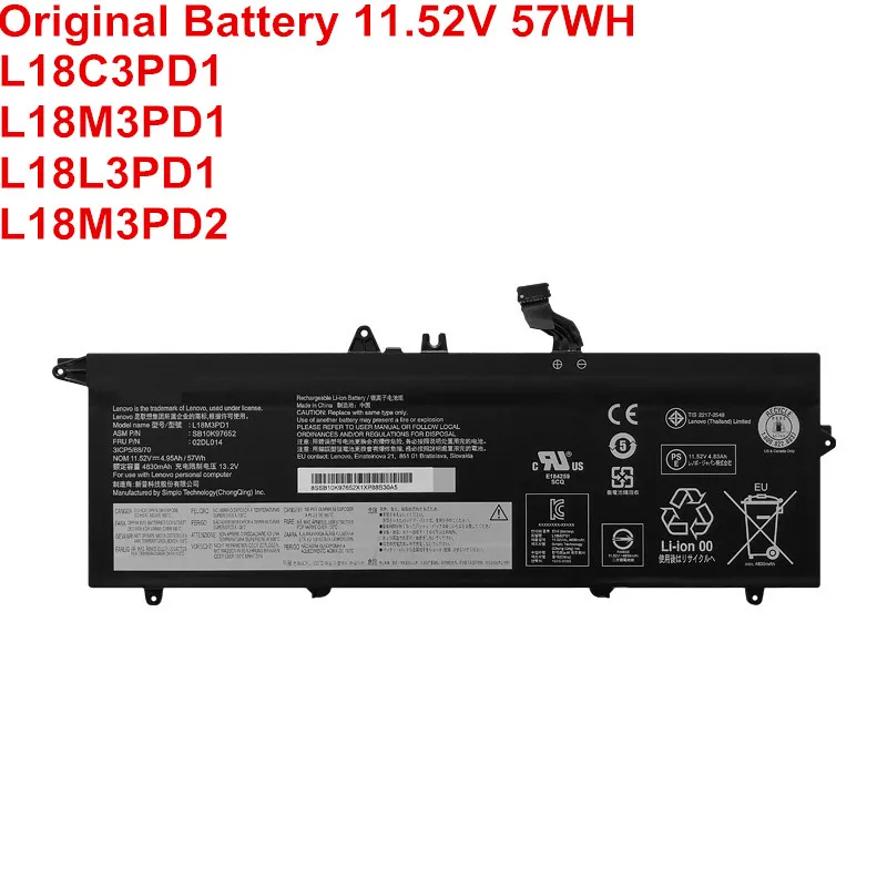 Аккумулятор для ноутбука Lenovo ThinkPad T490S T495S, 11,52 в, 57WH, 6 ячеек, L18M3PD2, L18M3PD1, L18L3PD1, 02DL013, 02DL014