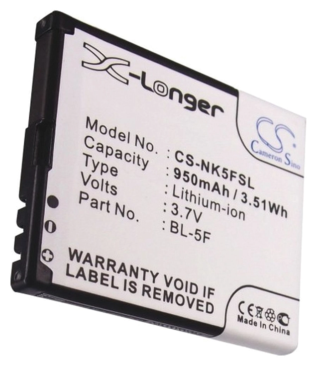 Аккумулятор CameronSino CS-NK5FSL/BL-5F, CS-NK5FSL для Nokia 6210, 6260, 6290, 6710, E65, N78, N79, N93i, Li-Ion, 950mAh, 3.7V, CS-NK5FSL