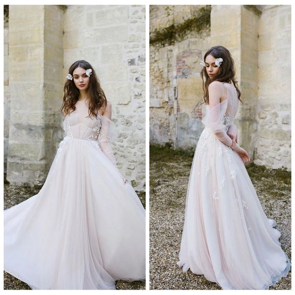 chic sheer шеи поэт длинные свадебные платья рукава see through свадебное платье линии с жемчугом бисероплетение zipper lace аппликация бич, White