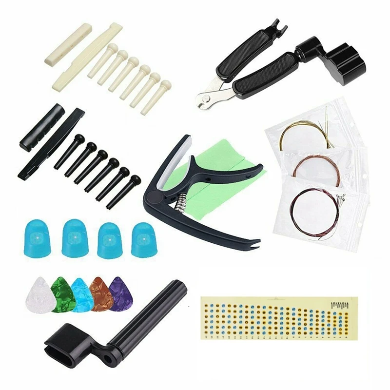 Аксессуары для гитары: накладные гвозди, наборы для гитары, накладные шнурки, подушки, шнурки, каподастр, наклейки, ткань для пианино