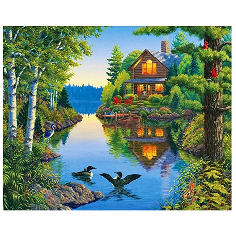 Алмазная живопись, полный набор алмазов, картина стразы, художественное ремесло, украшение для дома (озеро, дом)