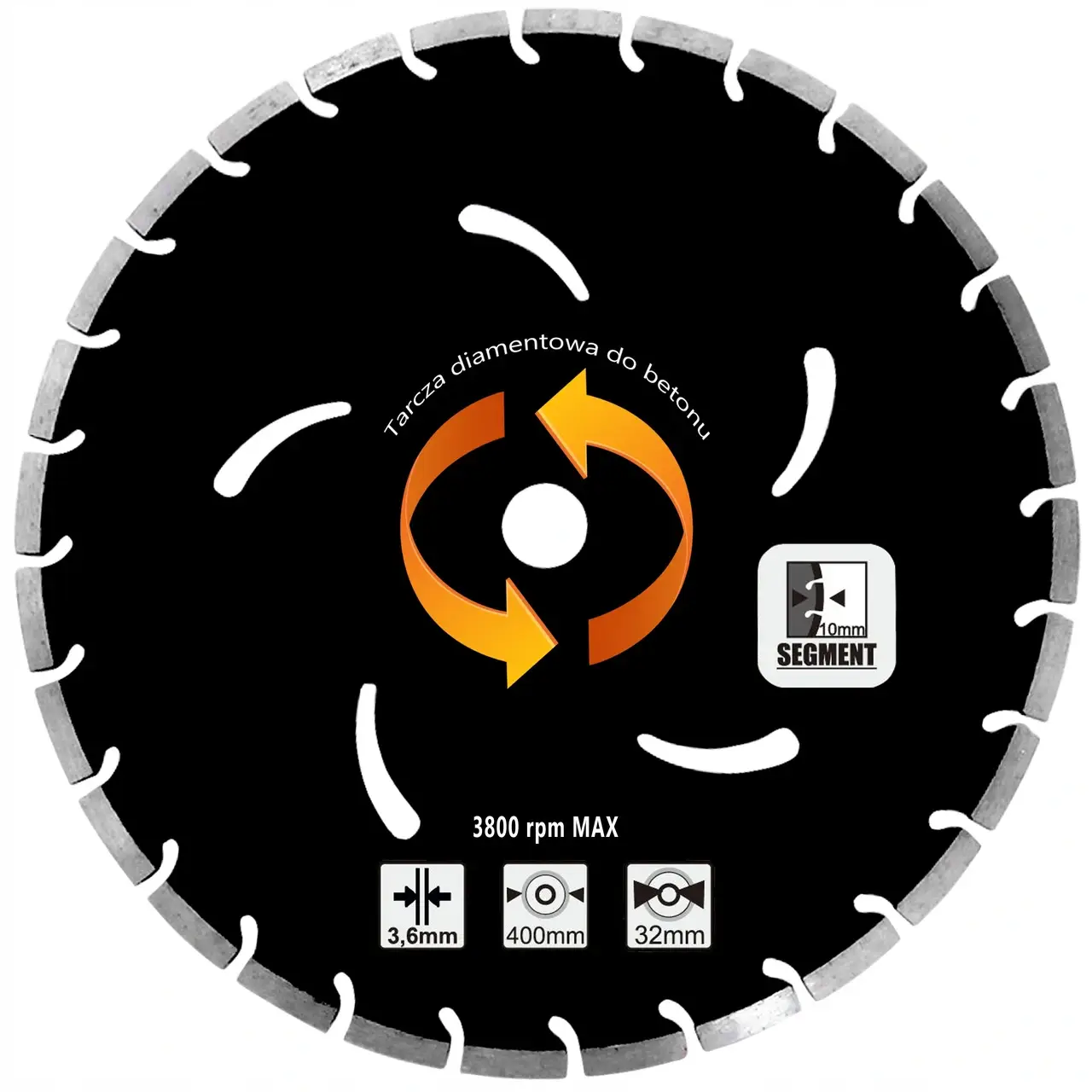 Сегментний алмазний диск для обробки будівельних матеріалів, таких як бетон, цегла, бруківка, клінкер, газобетон, керамічна плитка. Лезо з дуже високим вмістом алмазу, що означає, що воно має дуже хороші результати різання, не перегрівається та не іскриться. Особливості продукту: діаметр - 400 мм монтажний отвір - 32 мм висота насипу - 10 мм висока концентрація алмазів