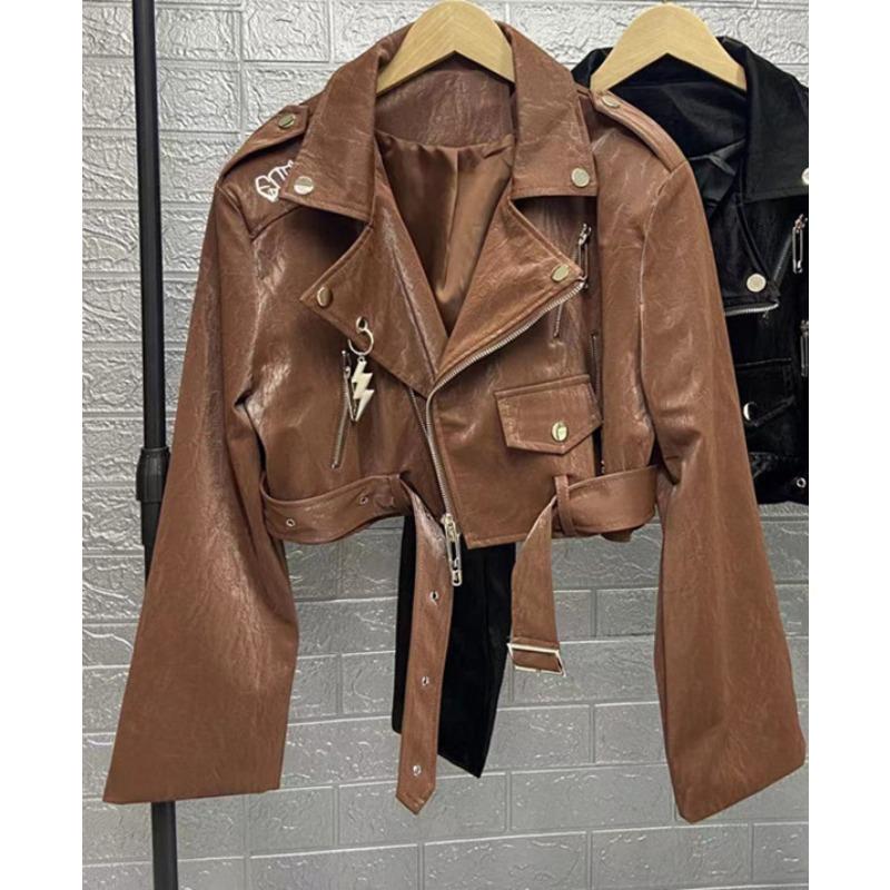 Американская тяжелая промышленность вышивка талия кружево мотоциклетная искусственная кожа куртка для женщин осень новая ретро кожаная куртка короткий стиль XL
