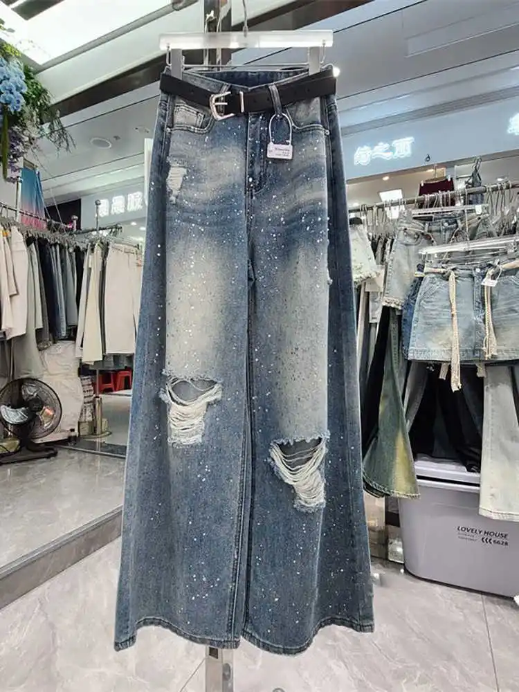 Джинсы с рваными дырками в американском стиле ретро, шикарные джинсовые брюки с градиентом и бриллиантами, свободные широкие брюки с высокой талией Design Sense