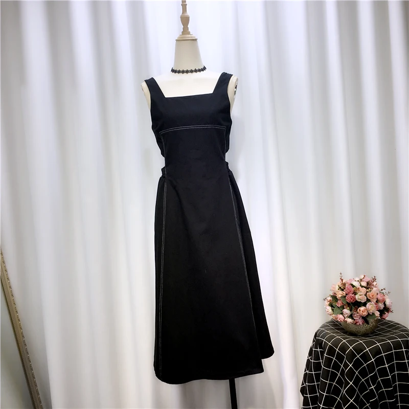 Korea-style New 2020 Summer Vintage Square Collar Slim Show Waist Strap Medium-long A-line Dress Women Sleeveless Casual Dress