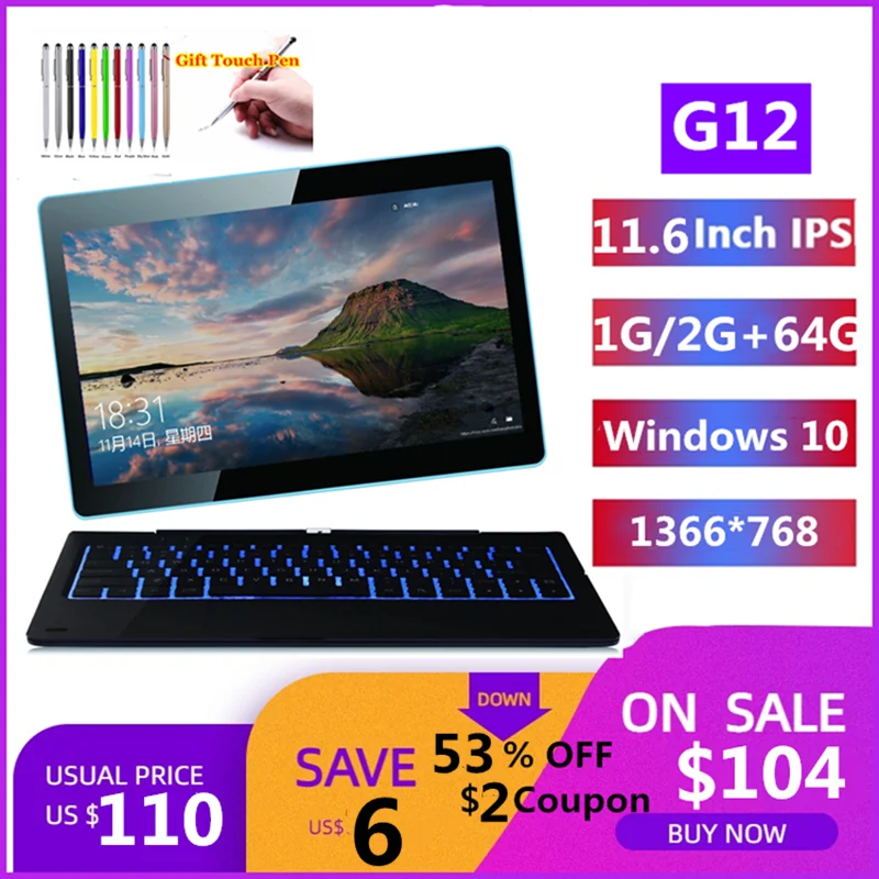 Планшет 2 в 1, 11,6 дюйма, 2 + 64 ГБ, Windows 10, Wi-Fi, 4 ядра, двойная камера