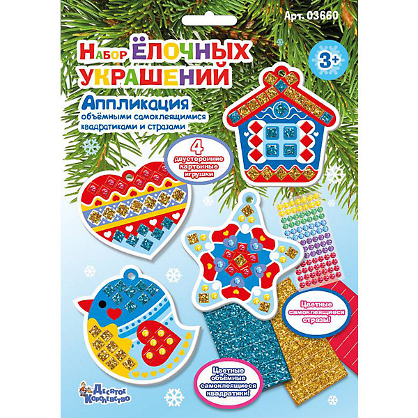 Набор для творчества позволит ребенку создать 4 картонные новогодние игрушки своими руками. Для этого нужно основы декорировать самоклеящимися квадратиками подходящих цветов и стразами. Готовыми поделками можно украсить елочку. Занятия с набором благотворно влияют на развитие моторики, внимания и усидчивости.