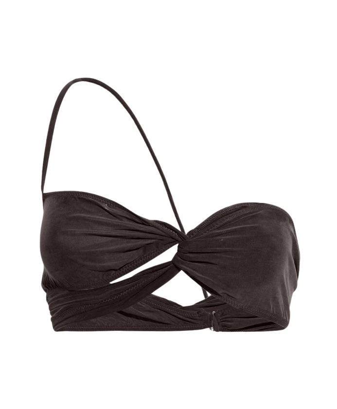 Коричневый укороченный топ в рубчик с надписью Espelho от Jacquemus. Изделие имеет застежку на крючок сзади, асимметричный силуэт с перекрученным эффектом и завязкой. Размеры модели: Рост: 176 см. Грудь: 85 см. Талия: 60 см. Бедра: 89 см. На модели размер: 36.