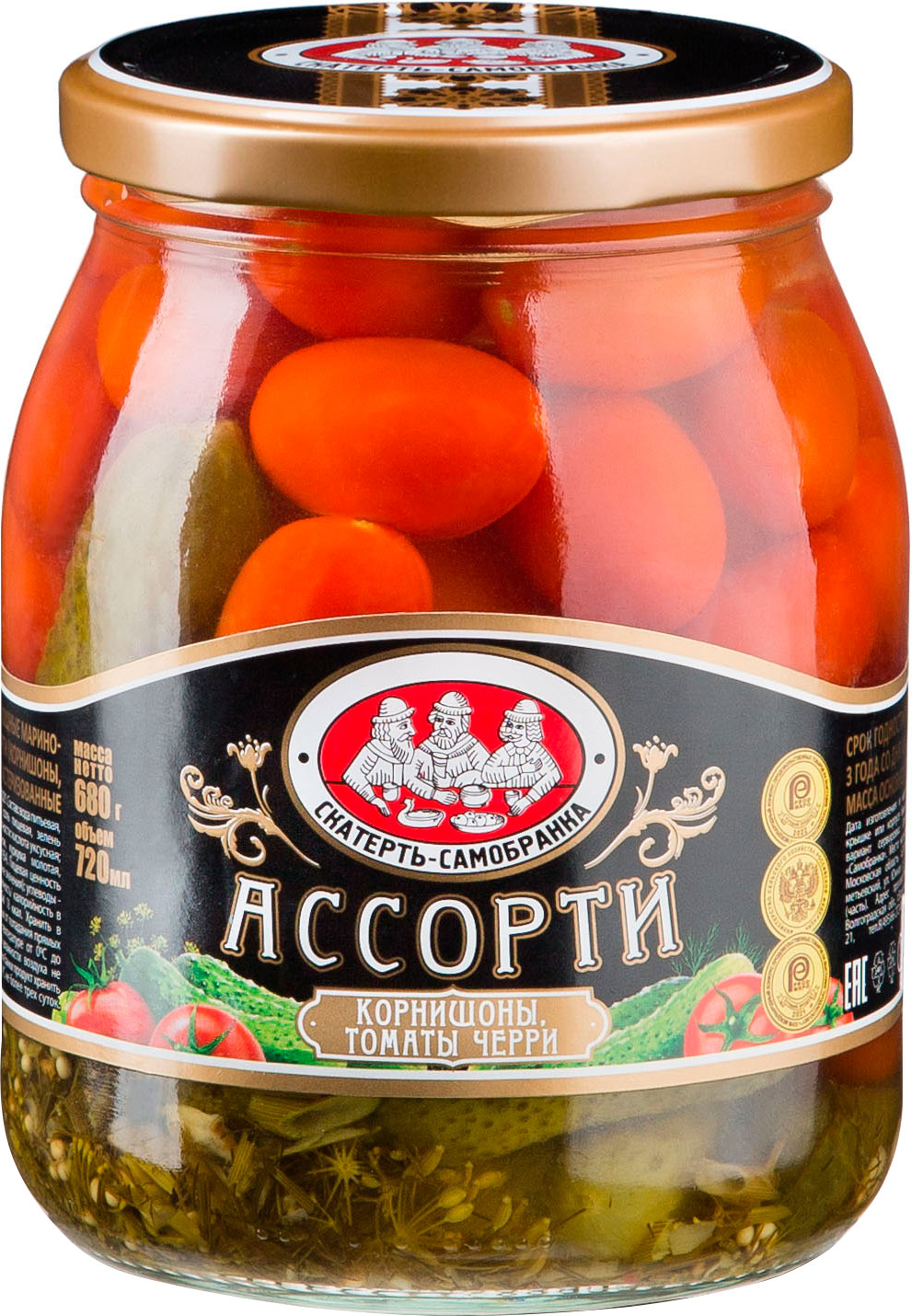 Срок годности в днях: 1095Состав: Корнишоны свежие, томаты черри свежие, вода, соль, сахар, регулятор кислотности – уксусная кислота, паприка, зелень укропа, семена горчицы и др. специи и пряностиПищевая ценность: Калорийность: 15Белки: 0Жиры: 0Углеводы: 4Страна изготовления: РоссияПроизводитель: Скатерть-Самобранка