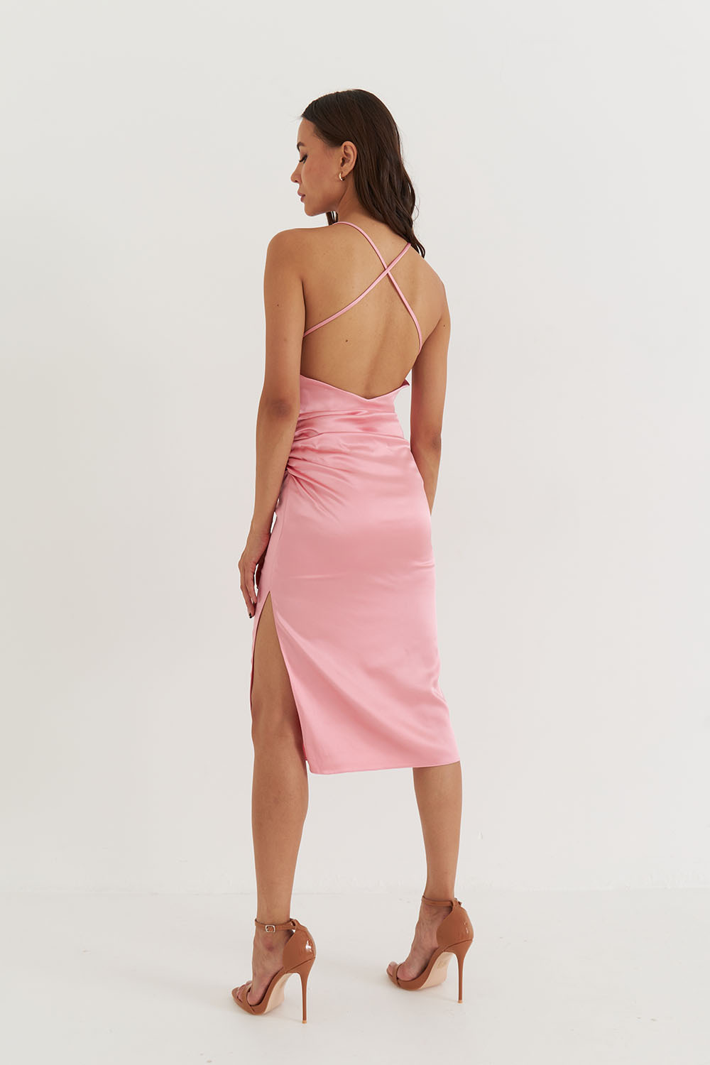 Атласное миди платье с открытой спиной цвета розовый лимонад