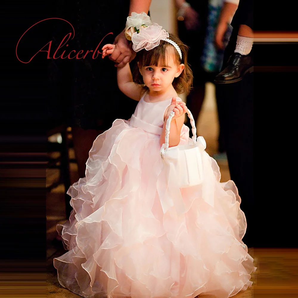 Атласные платья из органзы с оборками и глубоким круглым вырезом, розовые платья для девочек с цветами, красивые платья без рукавов с молнией на спине и длиной до пола для девушек, свадебные платья