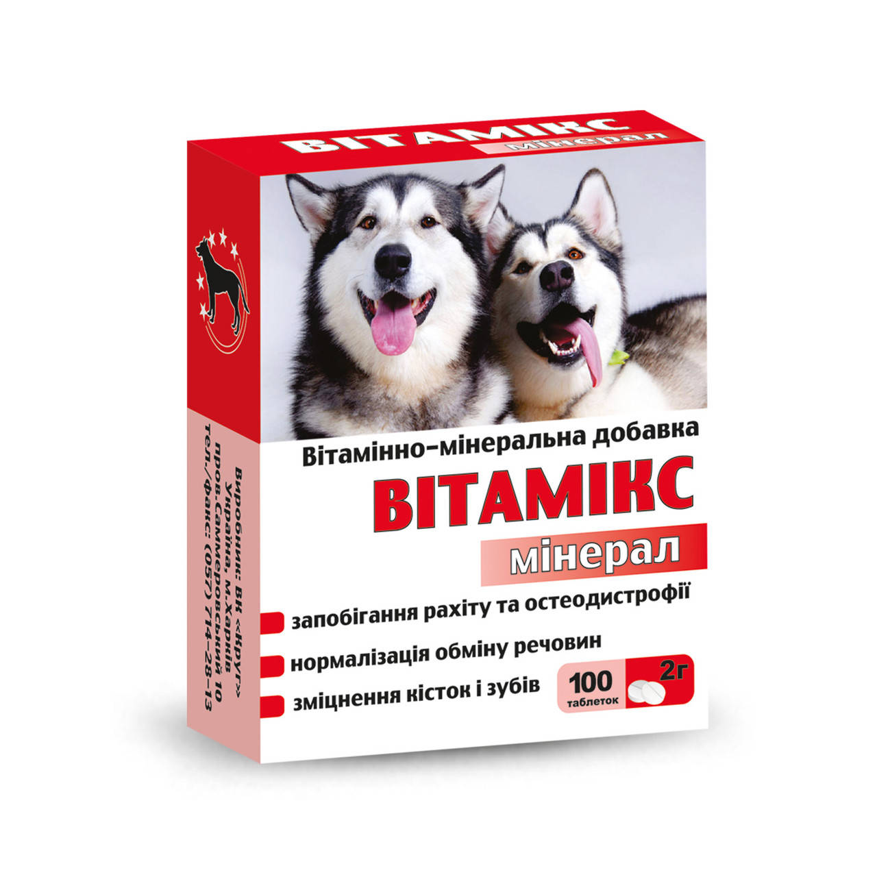 Витаминно-минеральный комплекс для собак, предназначенный для поддержания жизненно важных функций организма Вашего питомца. Рекомендован для предотвращение рахита и остеодистрофии, нормализация обмена веществ и укрепление костей и зубов. Где купить Содержит все незаменимые компоненты, необходимые при дефиците витаминов, макро- и микроэлементов. Помимо, отобранных в оптимальном соотношении, минералов (кальция, фосфора, калия, цинка, железа, магния, меди, марганца, кобальта) «Витамикс Минерал» содержит природные биологические стимуляторы – морские водоросли, протеин, биотин, пивные дрожжи с чесноком, экстракт элеутерококка, которые постоянно необходимы домашним животным для поддержания здорового и активного образа жизни. Показания: предотвращение рахита и остеодистрофии; нормализация обмена веществ; укрепление костей и зубов; нехватка кальция и фосфора; заболевание костно-хрящевой системы; профилактика рахита, артроза; переломы (для правильного формирования кости). Состав Сухое молоко, пивные дрожжи, ячменно-солодовый экстракт, лактоза, глюкоза, крахмал, витаминно-минеральный премикс, йод, янтарная кислота, метионин, растительный экстракт (элеутерококк, морская капуста). Анализ витаминно-минеральные компоненты — 42%; белки — 10%; жиры — 4%; зола — 12%; клетчатка — 14%; влажность — 6%; вспомогательные вещества — 12%. Дозировка щенки и собаки до 5кг. — 1 таблетка в сутки; собаки до 20 кг. — 2 таблетки в сутки; собаки более 20 кг. — 3 таблетки в сутки; беременные и лактирующие — 3 таблетки в сутки. Форма выпуска 100 таблеток в картонной коробке. Условия хранения Хранить в сухом месте при температуре от +2 до +20С. Срок годности 18 месяцев от даты изготовления.