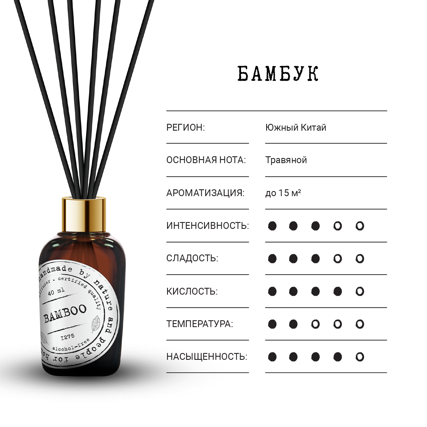Ароматический диффузор "Бамбук" от BAGO home звучит музыкой зеленых флейт тонких стволов. Открываясь свежестью травянистых нот в верхнем ярусе, легкий аромат встречает водянистую прохладу алоэ в сердце пирамиды. Завершает композицию нежная зелень ...