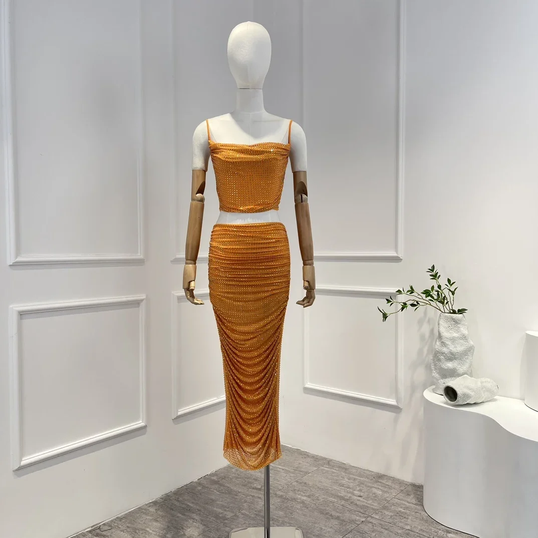 Summer New Arrival 2023 Orange Diamonds Shining Slip Crop Top Slim Midi Draped Skirt Matching Set Women High Quality