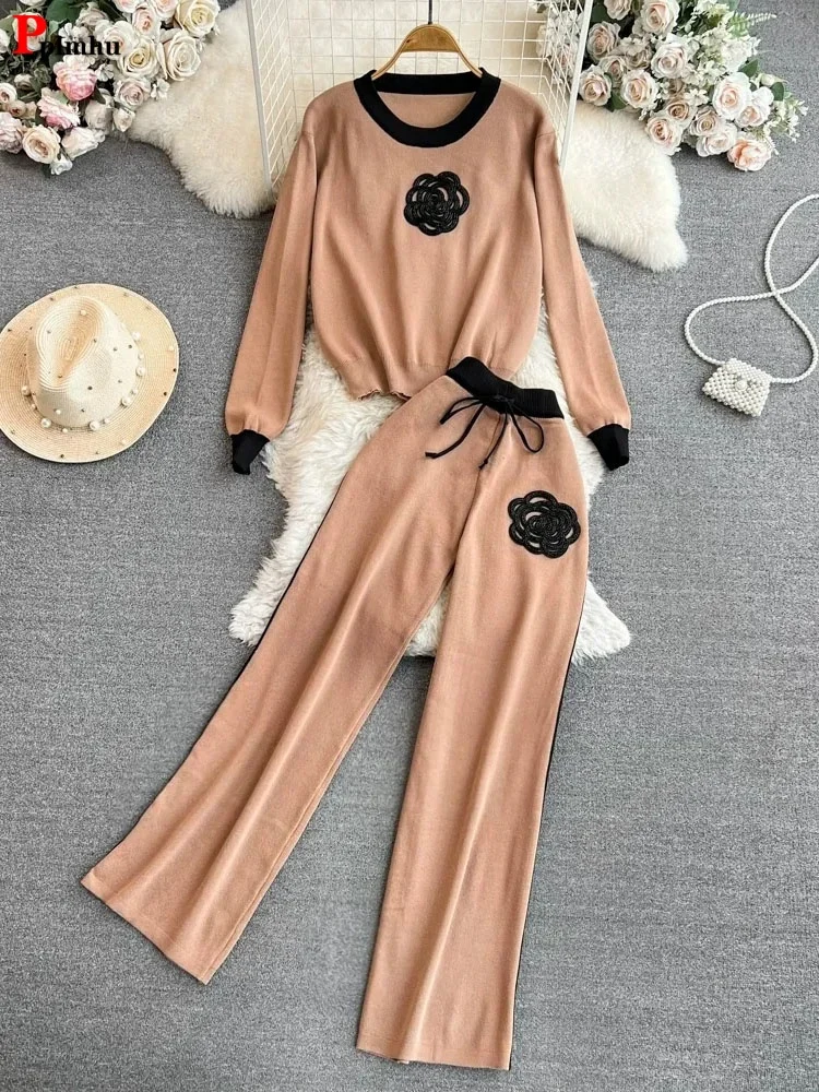 Chic Knitwears 2 Piece Sets Woman Soft Sweater Outfit High Waist Lace-up Wide Leg Pant Suits Vintage Embroidered Flares Ensemble