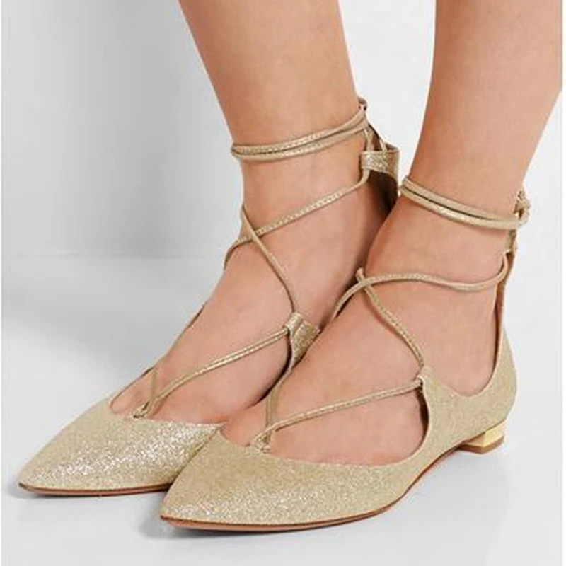 Балетки женские на плоской подошве, блестящие туфли с перекрестными шнуровками, заостренный носок, блестящие, золотистые синие, для отдыха, весенняя обувь