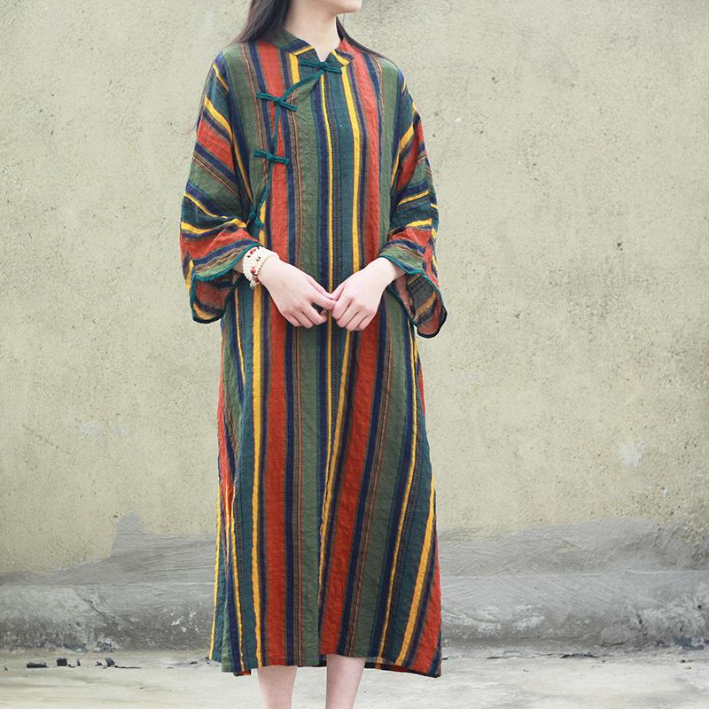 Johnature Summer Fashion Retro Plate Buckle Stand Pockets Striped Dress 2020 New Cotton Linen Comfortable Women Cheongsam Dress, Multi