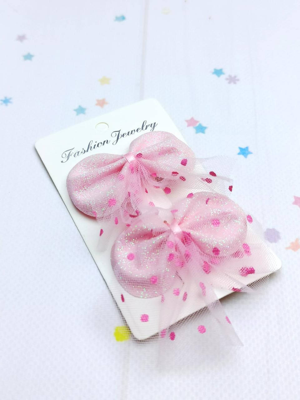 Бантики для волос блестящие, юбочка из фатина в горошек, пара, цвет розовый, заколка - уточка.