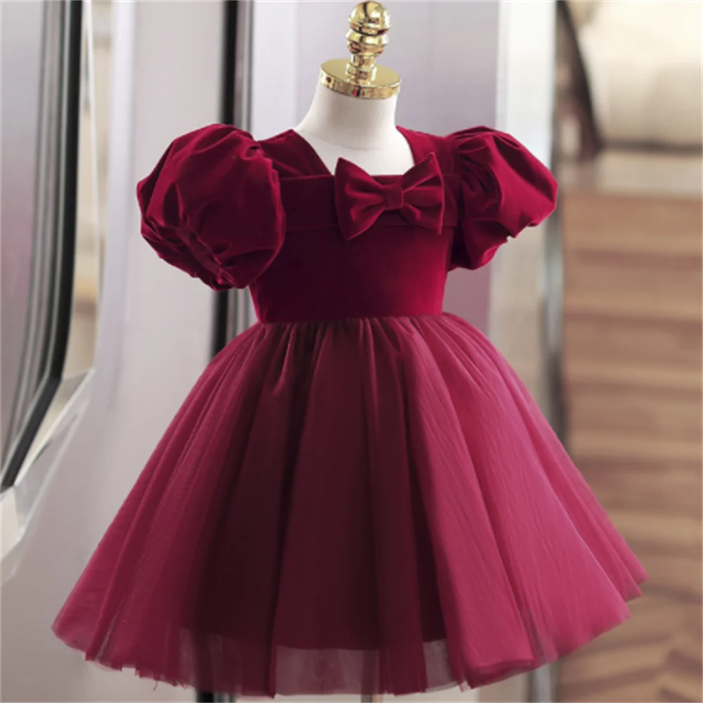 Бархатное свадебное платье принцессы с длинным рукавом, вечернее детское платье на день рождения с бантом для девочек, одежда для подружек невесты, детская одежда