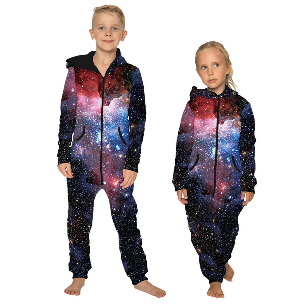 Бархатный комбинезон для мальчиков и девочек с длинными рукавами и 3D-принтом звездного неба, комбинезон на молнии с капюшоном, костюм для Хэ...