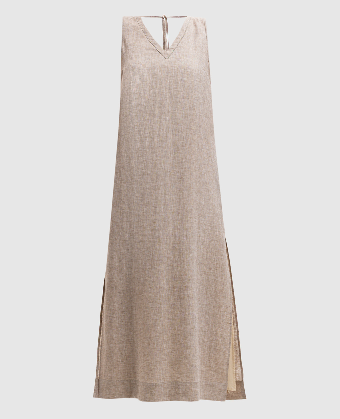 Бежевое платье из льна с разрезами, Бежевый, Повседневные платья