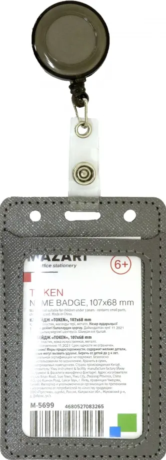 Бейдж вертикальный, TOKEN, 68x107 мм, с держателем-рулеткой (длина 60 см) и зажимом,