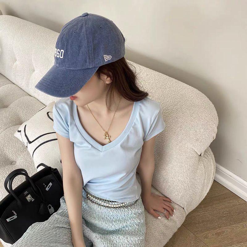 Белая Сексуальная Футболка из Чистого Хлопка с V-образным Вырезом и Короткими Рукавами, Женская Базовая Футболка, Летняя, Приталенная, Легко Сочетается с Топами, Стильный Нишевый Стиль Blue L