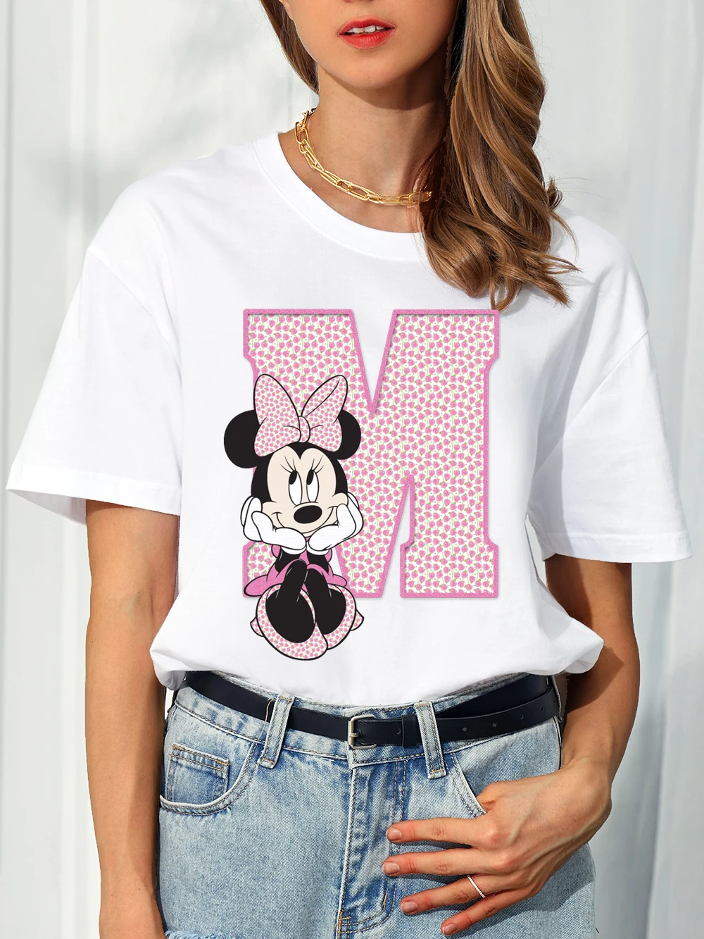 Белая женская футболка с коротким рукавом и принтом «Минни Маус», 26 букв