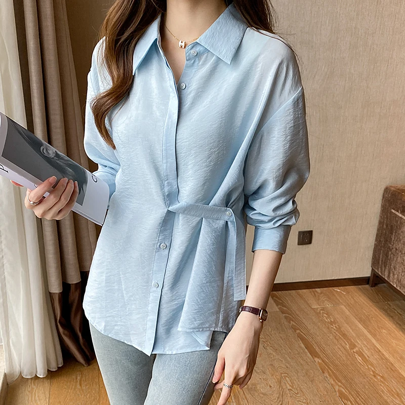 Белая рубашка женская летняя тонкая Солнцезащитная рубашка Свободная блузка с поясом Женские однотонные повседневные женские топы офисная шифоновая женская одежда