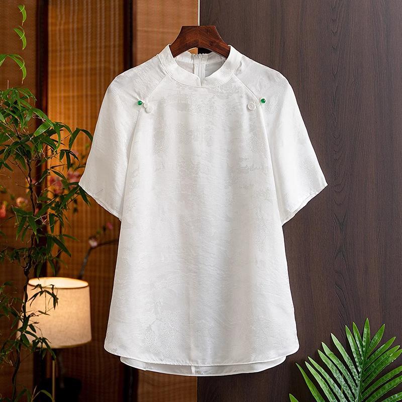 Белая рубашка из жаккардового шелка в китайском стиле для женщин, летняя новинка, ретро-пряжка, национальный трендовый стиль, шелковый топ для женщин L белый