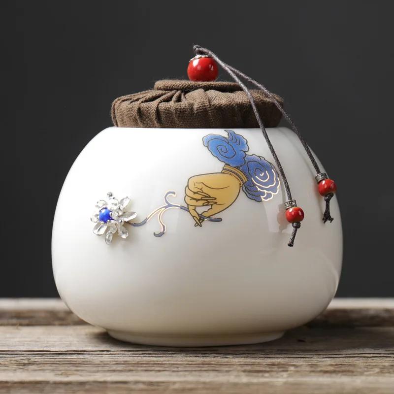 Белая фарфоровая инкрустированная серебряная банка для чая, керамическая герметичная банка в форме лотоса, влагонепроницаемая банка для хранения, коробка для зеленого чая пуэр для дома