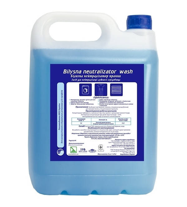 Білизна нейтралізатор прання М'який концентрат для пом'якшення тканини спеціально розроблений для використання у спеціалізованих пральнях Склад: катіонні ПАР, лимонна кислота Виробник: ТОВ «Бланідас», Україна Фасування: каністра 5 л Властивості: Нейтралізує залишки лугів в розчині і волокнах тканини Повний біологічний розпад Зберігає тканину від пожовтіння Добре пом'якшує тканину, попереджає осіданню часточок з статичним зарядом на синтетичних тканинах Білизна після прання надовго залишається свіжою та запашною Сфера застосування: Концентрований засіб для нейтралізації лужного середовища під час прання білизни у закладах охорони здоров'я різного профілю, на підприємствах фармацевтичної, хімічної, біотехнологічної, мікробіологічної, харчової та переробної промисловості, підприємствах комунального господарства, громадського харчування і торгівлі, на всіх видах транспорту, в учбових та дошкільних закладах, побуті та в інших закладах де потрібно дотримуватися належної гігієни Режими: Концентрацію підбирають в залежності від типу прання і залишкової лужності води Оптимальна концентрація при умові жорсткої води - 0,6% Засіб добавляється на стадії останнього ополіскування