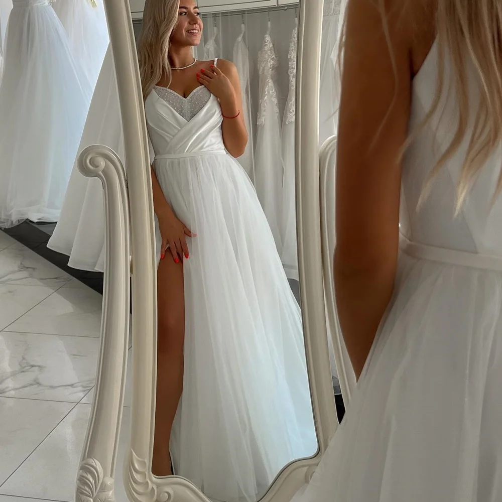 Белое свадебное платье-трапеция на бретелях-спагетти SONDR, сделанное на заказ Тюлевое свадебное платье с милой подругой, вечернее платье для невесты