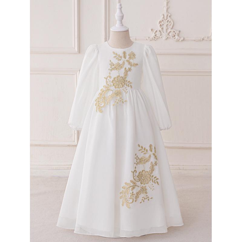 Белое сетчатое платье принцессы с вышивкой золотой нитью - Вечернее платье с длинным рукавом для девочек 140cm / 7 Years