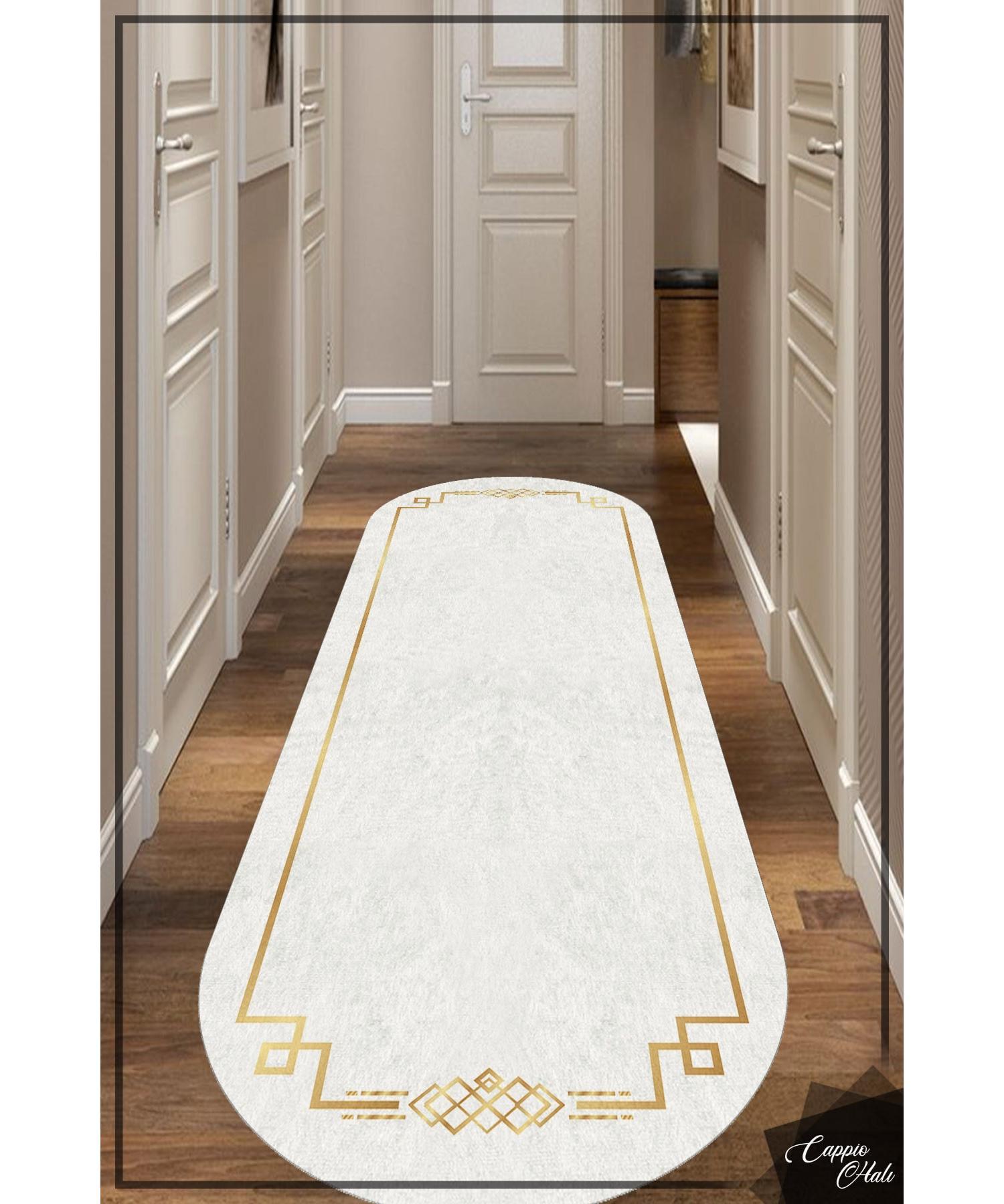 Белый овальный ковер с золотой рамкой (Нескользящее кожаное основание Машинная стирка 100x150) - Cp1058