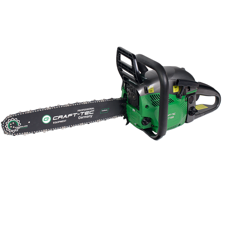2,9 кВт / 4 л.с. / 52 см³ / 45 см / 7,4 кгМагниевые крышки тормоза и стартераПраймер подкачки топливаШина и цепь - 2 комплектаИнерционный тормоз цепиАнтивибрационная системаАвтоматическая смазка цепиЛегкий ручной стартНазначение:Цепная бензопила Craft-tec CT 5000 является сбалансированной бензопилой с превосходными характеристиками. Бензопила CT 5000, позволяет распиливать древесину в диаметре до 90 см.Одноцилиндровый двухтактный двигатель мощностью 4 л.с.отличается низким уровнем вибраций и небольшим расходом топлива. Система принудительного воздушного охлаждения в сочетании с выверенным оребрением головки цилиндра обеспечивает оптимальный тепловой режим.Эта модель бензопилы обладает рядом преимуществ, отличающих её от других производителей: облегченный магниевый корпус, который делает бензопилу более прочной, чем пластиковый, при этом не уступая по весу другим пилам этого класса. Также она имеет двойной выхлоп, который позволяет легче "дышать" пиле при нагрузках, не давая ей "задохнуться" в собственных выхлопных газах. Инерционный тормоз цепи позволяет моментально остановить вращение бензопилы при отдаче или обратном ударе. Комплектуется автоматическим маслянын насосом, который подает масло для смазки цепи. В комплект входят 2 шины и 2 цепи. Пила оснащена антивибрационной защитной системой. Запуск двигателя тоже упрощен легким ручным стартом, который ускоряет запуск системы.Одно из самых главных правил по уходу - не перегревать, заливать хороший бензин и качественное двухтактное масло. Основные параметры:Мощность: 2,9 кВт (4 л.с.)Объем двигателя: 52 см3Количество оборотов: 9000 об/минДлина шины: 450 ммШаг цепи: 0,325"Толщина цепи: 0,058"Количество звеньев цепи: 72Заточка для поперечного разрезаЕмкость бензобака: 680 см3Емкость маслобака:350 см3Топливная смесь: бензин + 2-х тактное масло (1л / 20 мл)Скорость цепи при максимальных оборотах двигателя 2800-11000 об/минСмазка цепи: АвтоматическаяТактность двигателя: ДвухтактныйОхлаждение двигателя: ВоздушноеСистема заводки: Ручной стартерТормоз цепи: ДаСистема гашения вибрации: ДаРегулировка количества оборотов: ДаПоддержка постоянного количества оборотов под нагрузкой: ДаПраймерподкачки : ДаГабариты 410х235х265 ммВес (без цепи, шины с пустыми баками): 5,1 кгВес (общий): 7,4 кгКомплектация:БензопилаШина 450 мм – 2 штЦепь 72 – 2 штКанистра для приготовления топливной смеси – 1 штКлюч свечной – 1 штОтвертка – 1 штНапильник – 1 штШипы для фиксации пилы на дереве (отдельная пластина) – 1 штВинты для фиксации Шипов – 2 штКлюч 6-гранный для винтов – 2 штЧехол на шину, для хранения и транспортировки бензопилыИнструкция по эксплуатацииУпаковочная коробкаОтличительные особенности:Облегченный магниевый корпус Оснащена автоматическим тормозом пильной цепи, с возможностью принудительной активации, в случае необходимостиКачественный японский карбюратор Walbro способствует снирению расхода топлива и обеспечивает стабильность работы пилы в любом положенииМощный двухтактный двигатель номиналом 4 л.c.Усиленная поршневая группа, с ресурсом до 5 лет эксплуатацииАнтивибрационная системаУпрощенный доступ к фильтруАвтоматическая смазки цепи Защита от отдачиУлучшенная система зажиганияПринудительная подкачка топлива - праймер, для облегченного запуска двигателя. Подкачка производится в холодное, зимнее время или при первом 